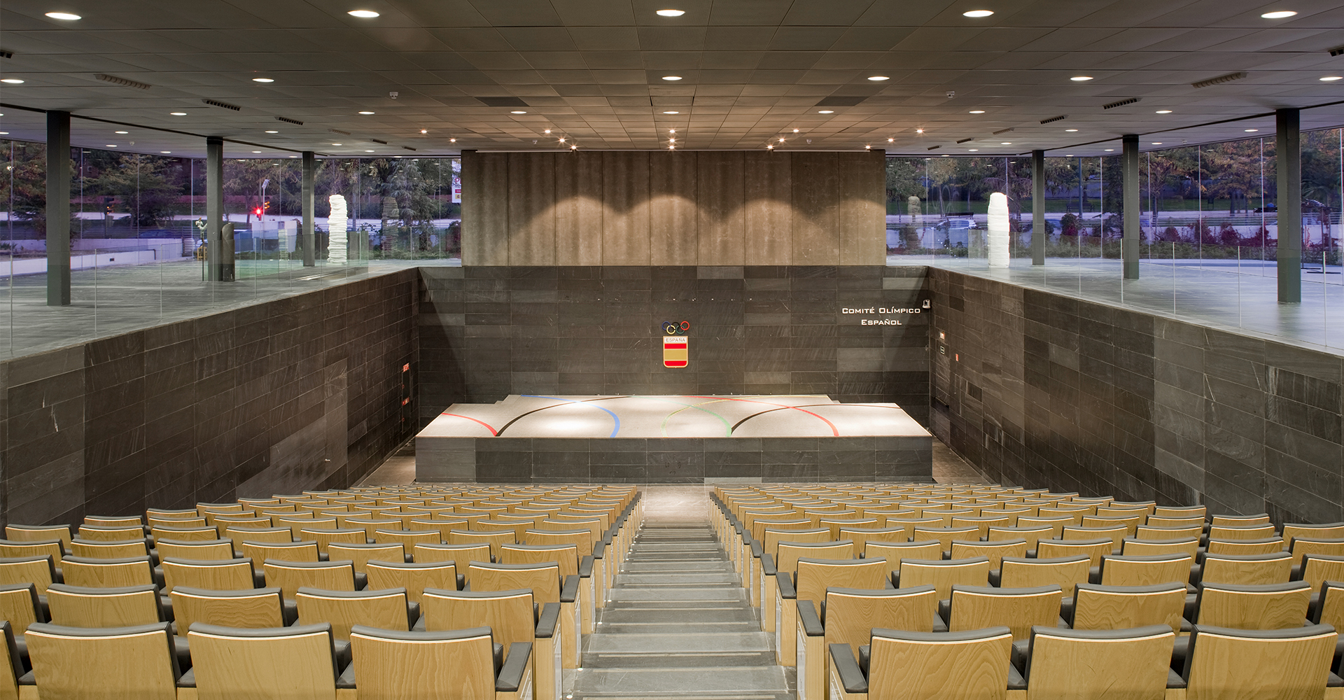 Dans le cadre du projet de faire de Madrid la future ville olympique, le siège du Comité olympique espagnol a été agrandi d’une nouvelle annexe destinée à accueillir un auditorium, des salles de conférence, des locaux pour l’organisation d’événements et un gymnase. D’une superficie de 1400 m2, l’étage supérieur, qui constitue l’accès principal, est exclusivement utilisé pour des conférences et dispose d’un grand auditorium qui peut être agrandi en hall. Une galerie périmétrique permet l’accès à diverses salles et sépare l’enceinte de l’extérieur par une baie vitrée qui s’ouvre sur une cour intérieur, entre le nouveau et l’ancien. L’étage inférieur abrite les salles de conférence.