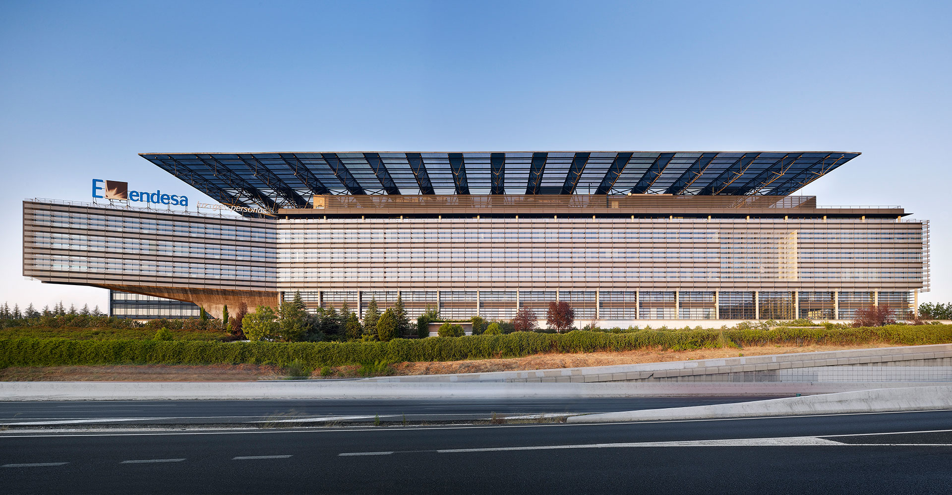 Une toiture monumentale, protectrice et technologique, relie les deux volumes du bâtiment au-dessus de l’autoroute. L’un, replié et en apesanteur, exprime par son extrême longueur la capacité du site et la force de l’entreprise. L’autre, stable et fonctionnel, entrelace son rez-de-chaussée en forme de peigne à l’escalier urbain et piétonnier de la route d’accès. Sous le toit se dessine un vide fragmenté par des passerelles qui le parcourent et le traversent, le divisent en zones plus petites et donnent de l’amplitude à l’escalier. Il s’agit du premier bâtiment en Espagne à avoir reçu la certification triple A en termes de qualification énergétique.
