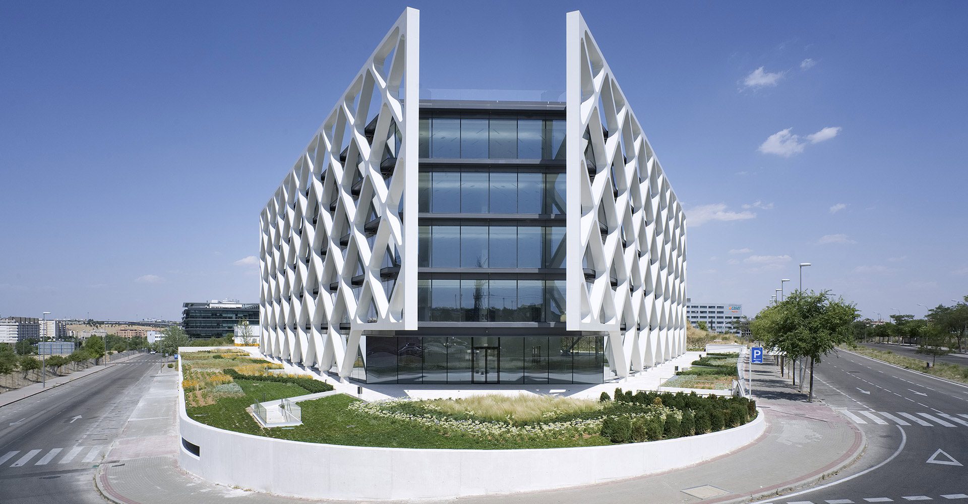 Il s´agit d´un bâtiment isolé, avec un plan d´étage de géométrie triangulaire et une architecture innovatrice qui extrait la structure porteuse des planchers à l'extérieur configurant une structure en treillis qui, à son tour, couvre la fonction de protection solaire de la façade. Cette proposition permet de maximiser la lumière naturelle des plans d´étage et l'amplitude de l'espace intérieur. Un seul noyau central est prévu, englobant les différents espaces de communication verticale, des toilettes et des locaux techniques. Avec une surface en superstructure de 14,299 m² répartie le long de cinq étages, Oxxeo compte avec une dotation de 450 places de stationnement réparties dans deux niveaux en sous-sol.