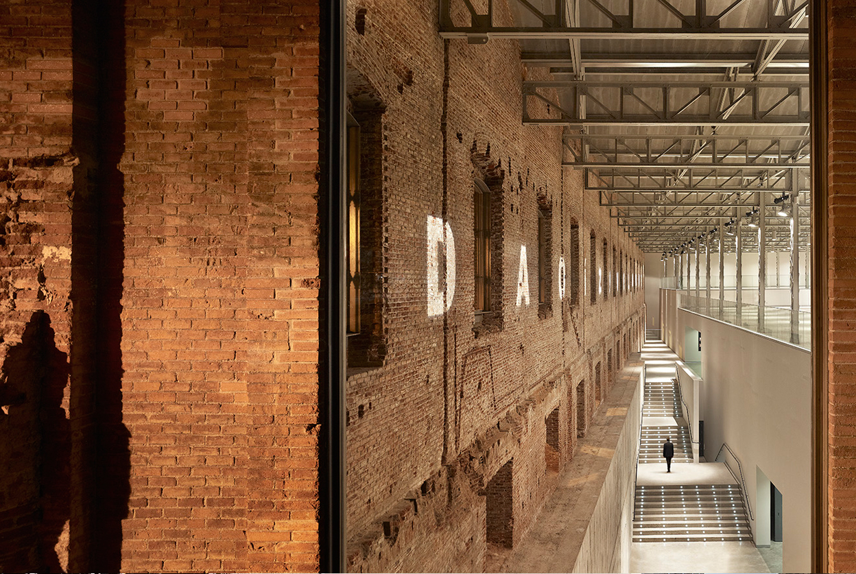 Se crea un espacio intermedio de separación entre la antigua nave y los nuevos usos que potencia el carácter del edificio existente y crea una zona de filtro y protección del exterior. Estos espacios intersticiales permiten establecer una conexión visual que propicia diferentes experiencias espaciales.