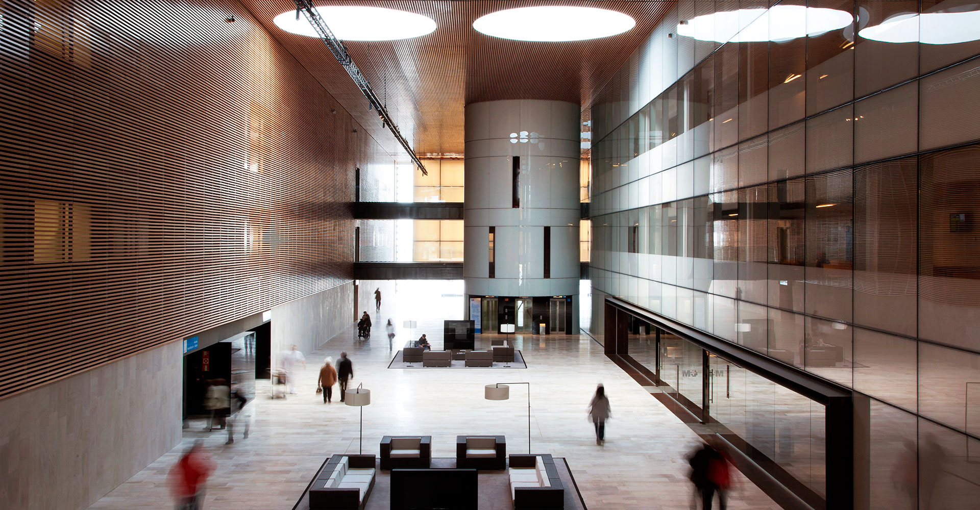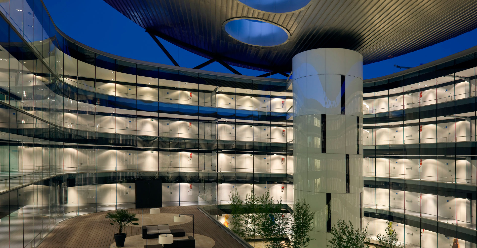Sobre esta estructura se disponen dos unidades de hospitalización, dos coronas ovaladas trazadas con amables curvas que se alejan sensorialmente de las depresivas formas residenciales del “bloque pastilla” racionalista, y se inspiran en lo mejor de la arquitectura reciente residencial: eliminación de pasillos y por tanto de ruido, circulaciones concéntricas, luz y silencio en torno a un atrio común.