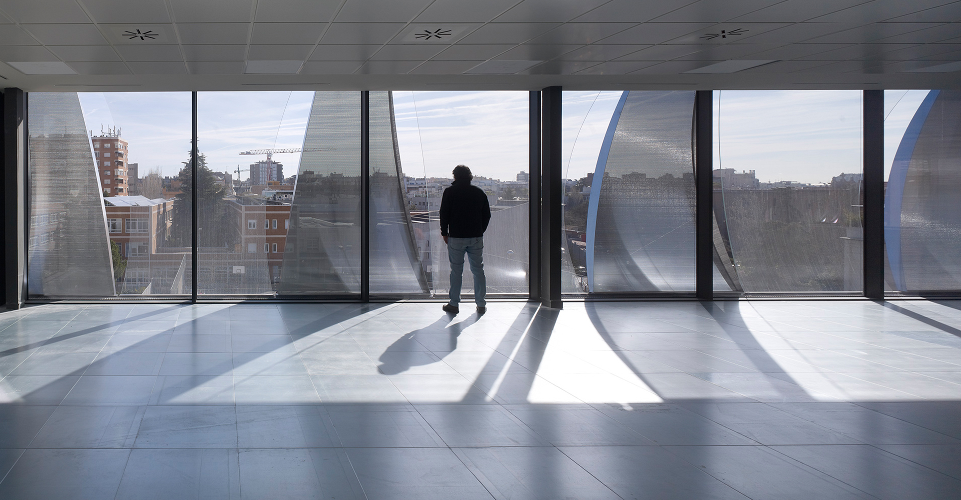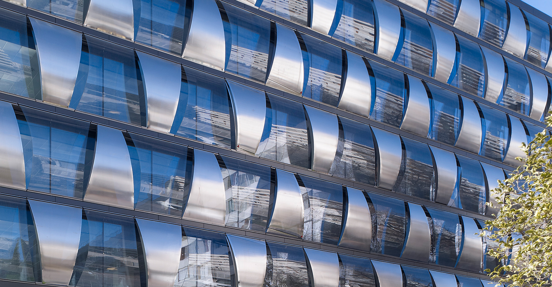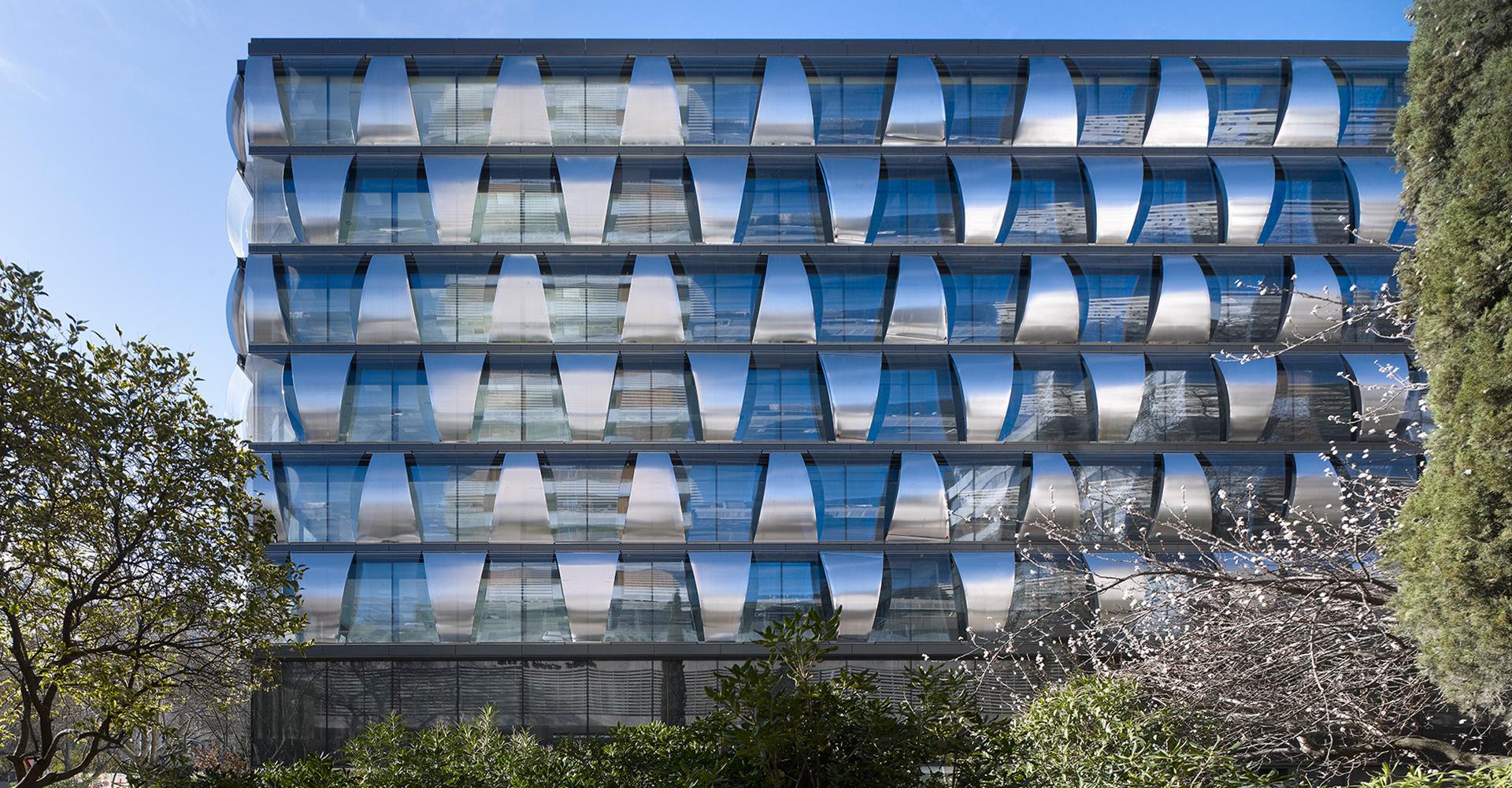 Su fachada de doble piel permite el control medioambiental y acústico subrayando la transparencia, adoptándose en las cuatro fachadas una solución de muro cortina, con un trazado tridimensional en el que se combinan vidrio y chapa de acero inoxidable microperforado.