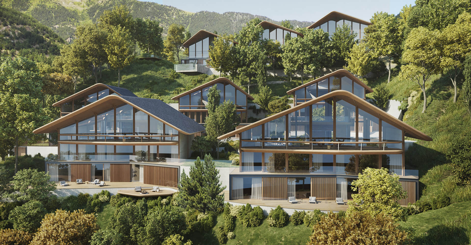 Las distintas unidades residenciales se disponen en la parcela buscando maximizar las vistas lejanas y la captación de radiación solar directa dentro del respeto a la acentuada topografía de lugar.