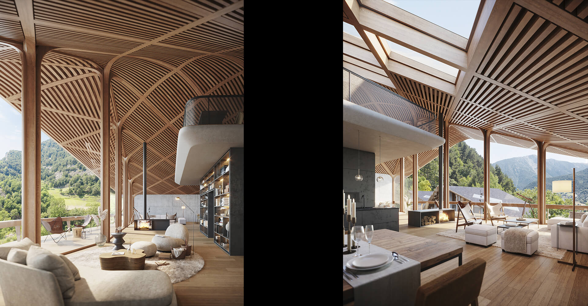 La cubierta inclinada de pizarra y los materiales de fachada tradicionales - piedra y madera - se entienden como elemento característicos de la arquitectura de lugar y, por tanto, se incorporan a la propuesta pero escapando de cualquier convencionalidad.