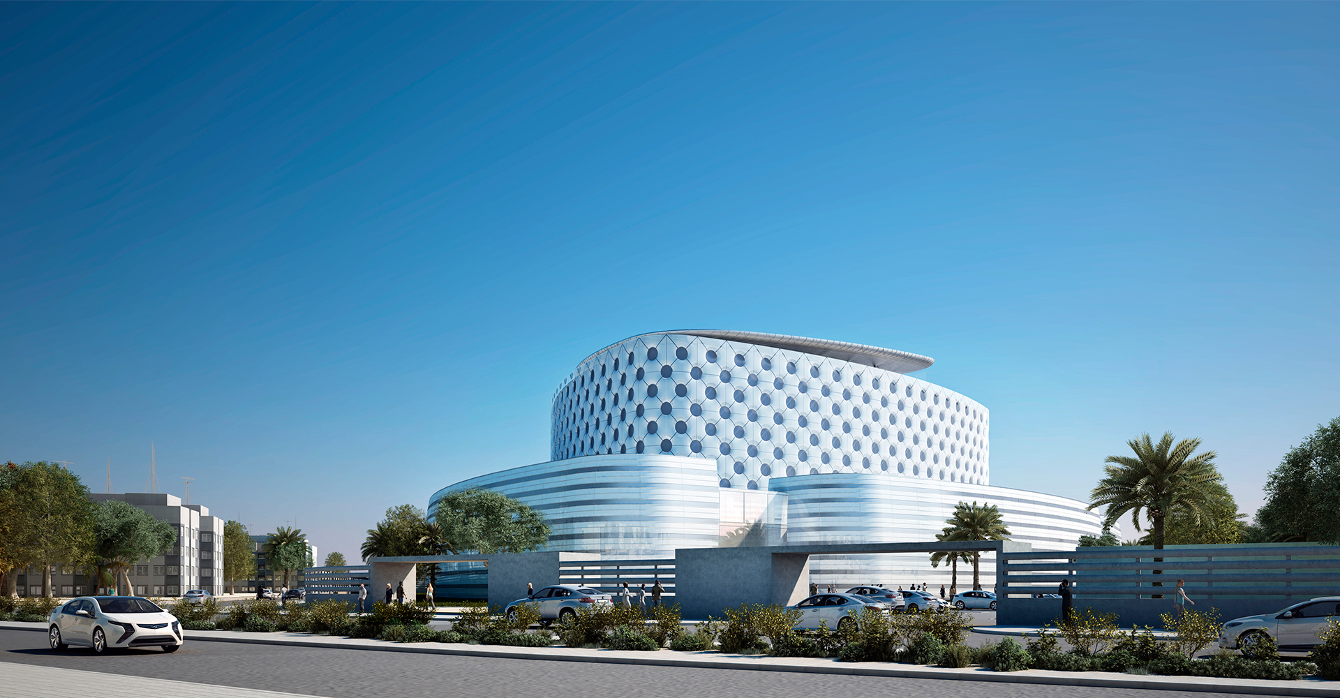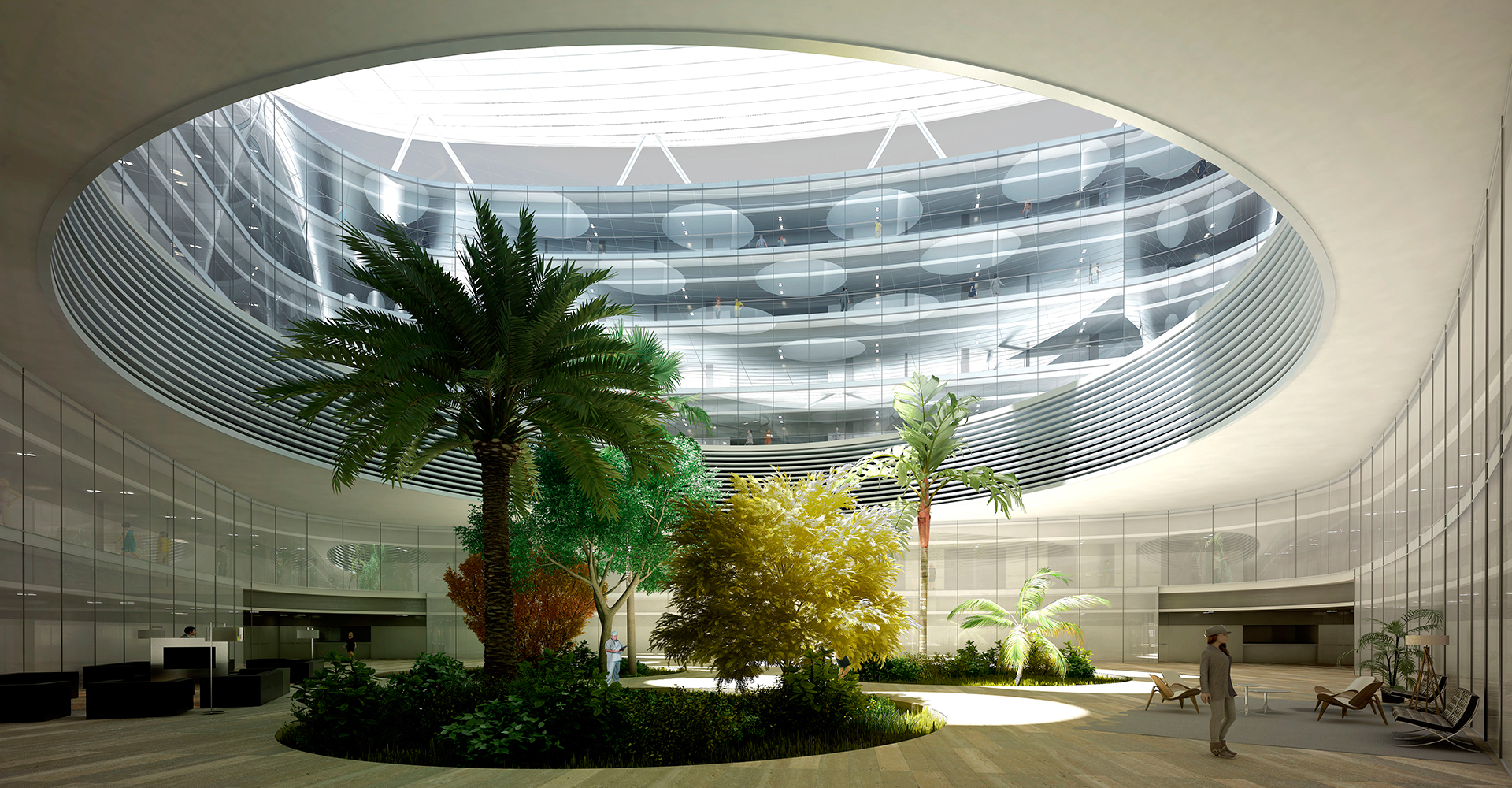 Un grand soubassement manufacturier englobe les différentes zones sanitaires de l’hôpital et soutient un volume en verre qui abrite la zone d’hospitalisation. Cet aspect manufacturier se traduit par un complexe système d’espaces articulés à l’intérieur des trois prismes qui forment le soubassement, enchaînés les uns aux autres comme s’il s’agissait d’une machine, une « machine à soigner ». Ce traitement éminemment fonctionnel du soubassement souligne celui, hautement symbolique, de la tour d’hospitalisation. Le bâtiment central de 7 étages abrite les chambres et les soins intensifs et dépasse les bâtiments environnants, de trois étages chacun. Comme nul autre espace, la zone d’hospitalisation représente l’espace du séjour, dans lequel le patient a besoin de tranquillité et de lumière pour se reposer. Dès le début, nous avons cherché à séparer cet espace, consacré aux personnes malades, des zones d’activité fonctionnelle, en les élevant au-dessus d’une toiture végétale qui prend tout son sens lorsqu’elle se transforme en un jardin observable depuis les chambres.