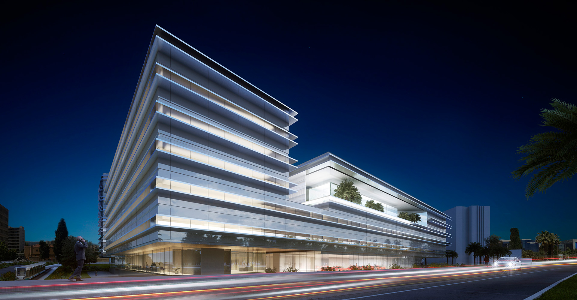 Parallèlement à cette place, nous créons dans les étages supérieures une grande vitrine qui regarde vers la Promenade des Anglais, l’aéroport, et la mer et qui définit l’identité architecturale de l’ensemble, comme un grand signal d’accueil à bras ouverts pour les voyageurs de passage.