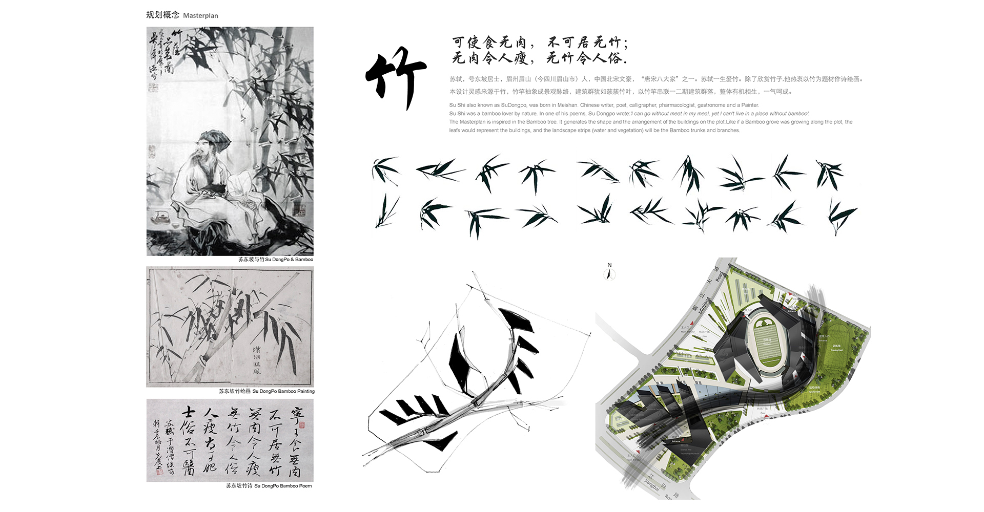 Le design général du complexe s’inspire de la personnalité imposante de la dynastie Song, notamment du poète Su Dongpo, le génie le plus versatile de l’histoire de la littérature chinoise. Le plan directeur se base sur les dessins traditionnels de bâtiments réalisés en bambou et sur les poèmes de Su Dongpo. Les bâtiments, eux, représentent des feuilles de bambou et les bandes de paysage, l’eau et la végétation, suggèrent des branches et des troncs de bambou.