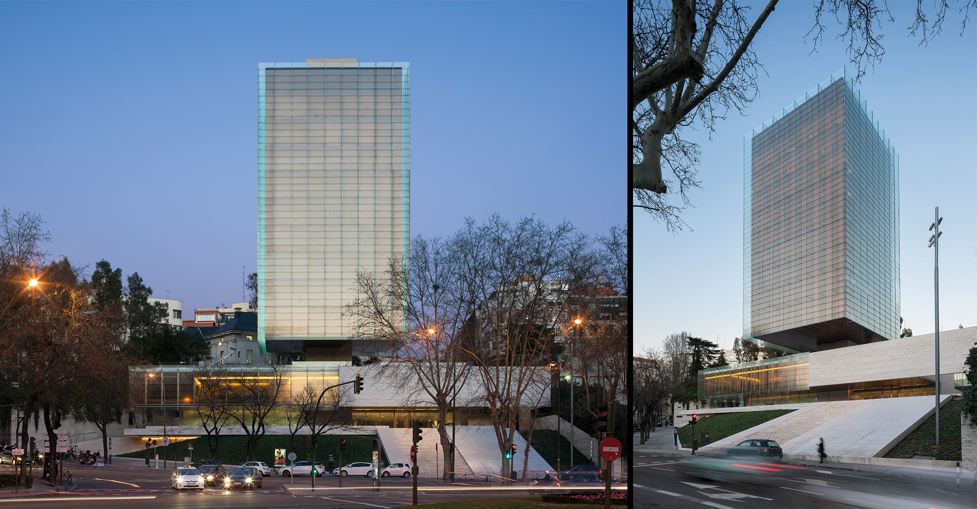 Son emplacement à l’intérieur du centre historique de Madrid, et l’usage de techniques absolument innovantes pour leur époque, telles que l’utilisation du verre comme instrument de contrôle climatique ou l’approche structurelle singulière (une structure en suspension, excentrique et de type bossoir) pour sa construction font de l’édifice Castelar l’une des œuvres les plus remarquables de M. Rafael de La-Hoz Arderius, Médaille d’or de l’architecture en 2000.Le nœud de communications verticales abandonne la position qui a habituellement dans ce type de tours, pour se situer à l’extérieur et prendre la forme d’un bossoir permettant de suspendre le volume construit. Le sol est ainsi libre de piliers et de services, et le volume apparaît comme en apesanteur, tel un prisme de verre flottant au-dessus de sa base.