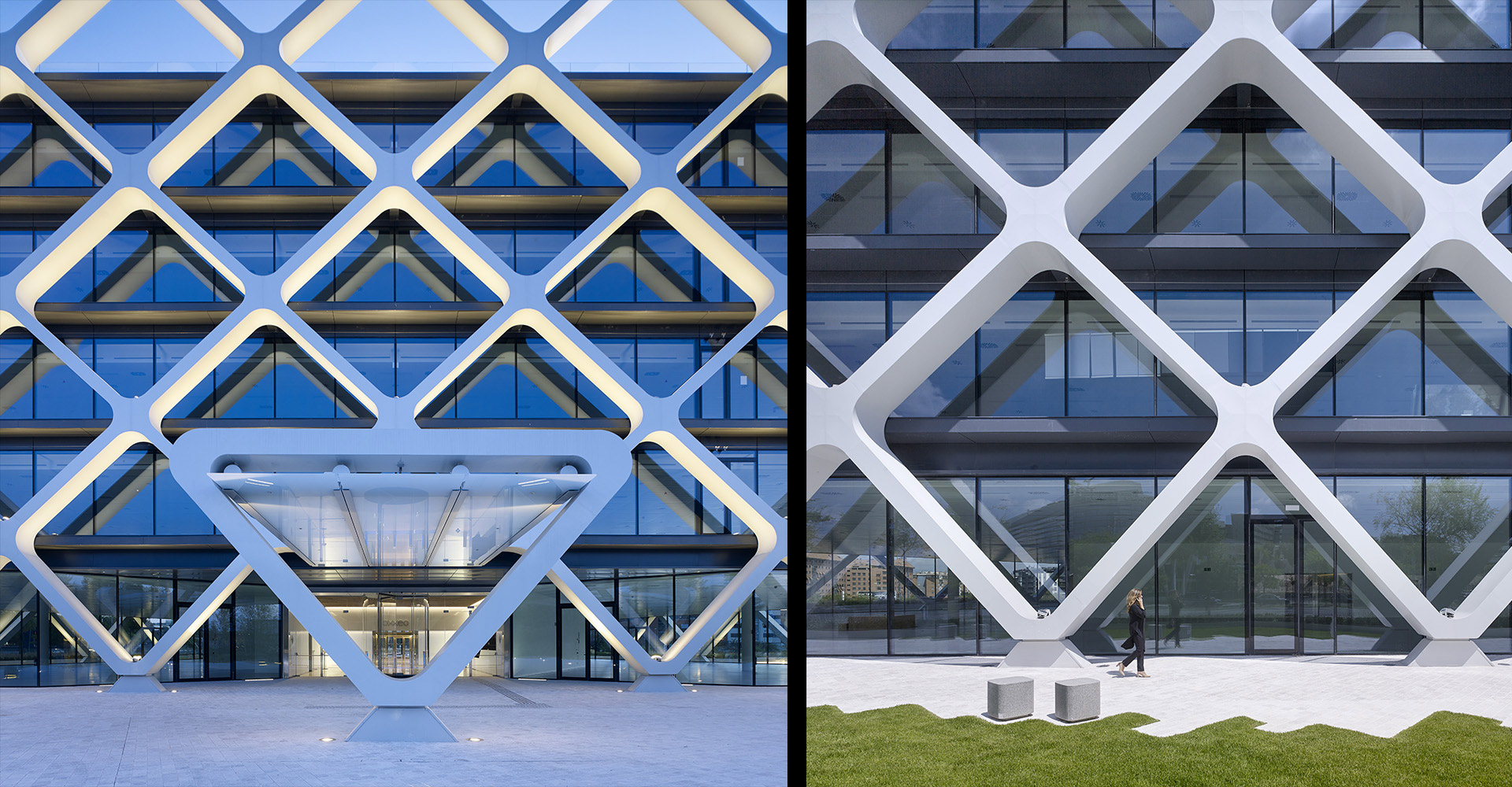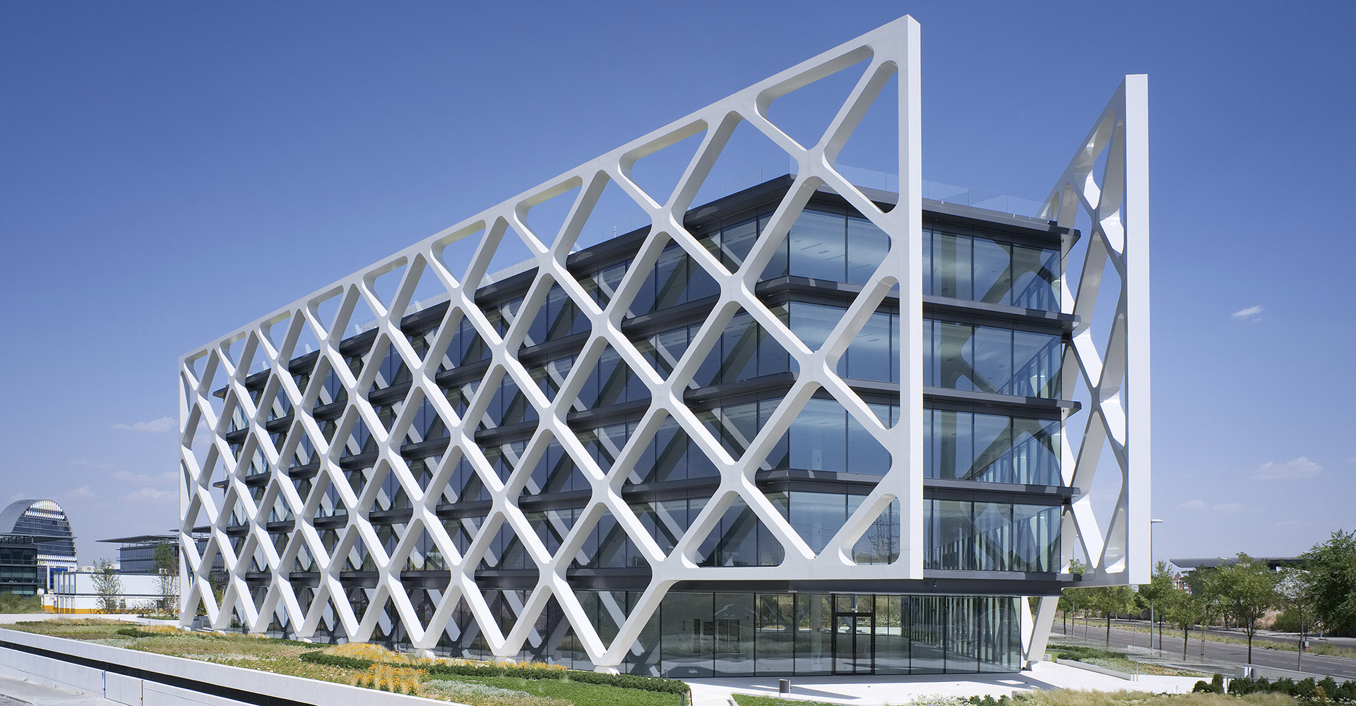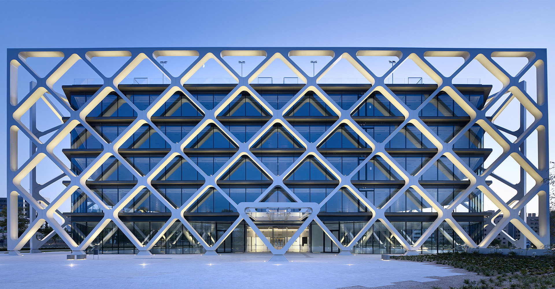 Il s´agit d´un bâtiment isolé, avec un plan d´étage de géométrie triangulaire et une architecture innovatrice qui extrait la structure porteuse des planchers à l'extérieur configurant une structure en treillis qui, à son tour, couvre la fonction de protection solaire de la façade. Cette proposition permet de maximiser la lumière naturelle des plans d´étage et l'amplitude de l'espace intérieur. Un seul noyau central est prévu, englobant les différents espaces de communication verticale, des toilettes et des locaux techniques. Avec une surface en superstructure de 14,299 m² répartie le long de cinq étages, Oxxeo compte avec une dotation de 450 places de stationnement réparties dans deux niveaux en sous-sol.