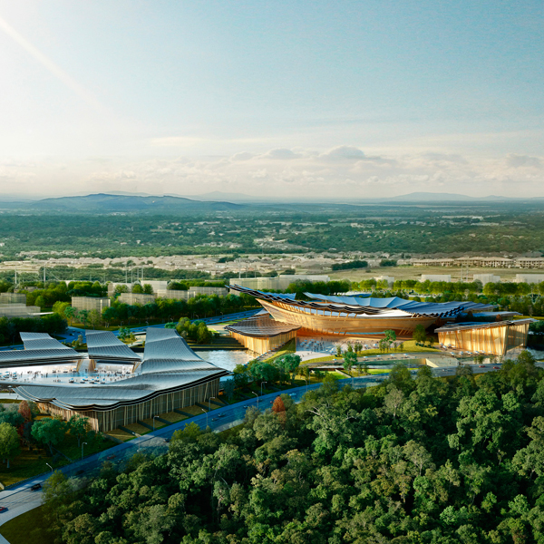 A cultural area composed of three interrelated volumes, highlighting a wide central cube-shaped glass lantern