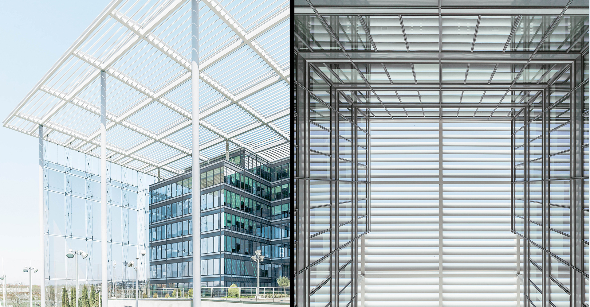 A “virtual” box constructed with aluminium slats and stainless steel mesh hides in its interior, protecting it from the sun, a glazed “material” box.