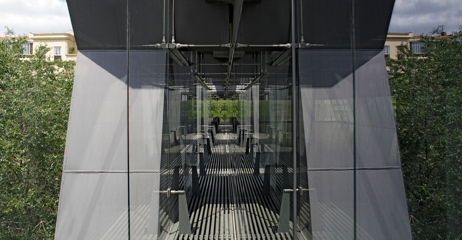 No se trata por tanto de una sustitución jardín por edificio, sino de una transformación jardín por jardín habitado. Transformada la trama vegetal existente en geometría sustentante se inserta en ella el sólido habitable.