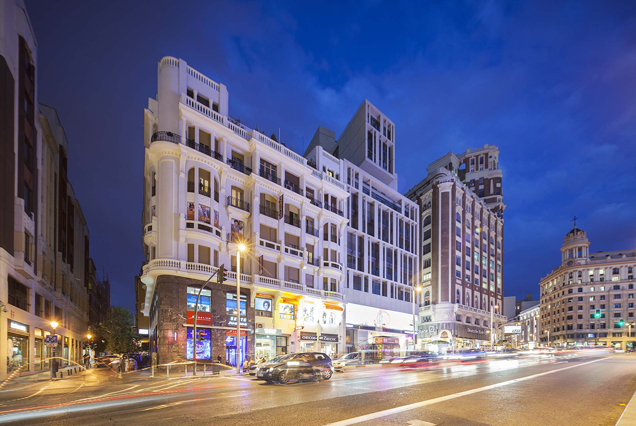 La nouvelle façade du bâtiment est caractérisée par une charpente allant du sol au toit, sur laquelle est superposé un réticule de pilastres stylisés de granit qui lui donnent mouvement et profondeur. Il s’agit ici d’imiter les rythmes de la Gran Vía, sans avoir à les répéter. L’ensemble est couronné par un volume qui dialogue avec le kiosque du bâtiment voisin du Palais de la Presse et met ainsi en valeur le jeu rotulien requis par la Gran Vía à ce point d’inflexion. Le croisement se dessine en suivant la succession en double étage appréciable dans les constructions contigües.
