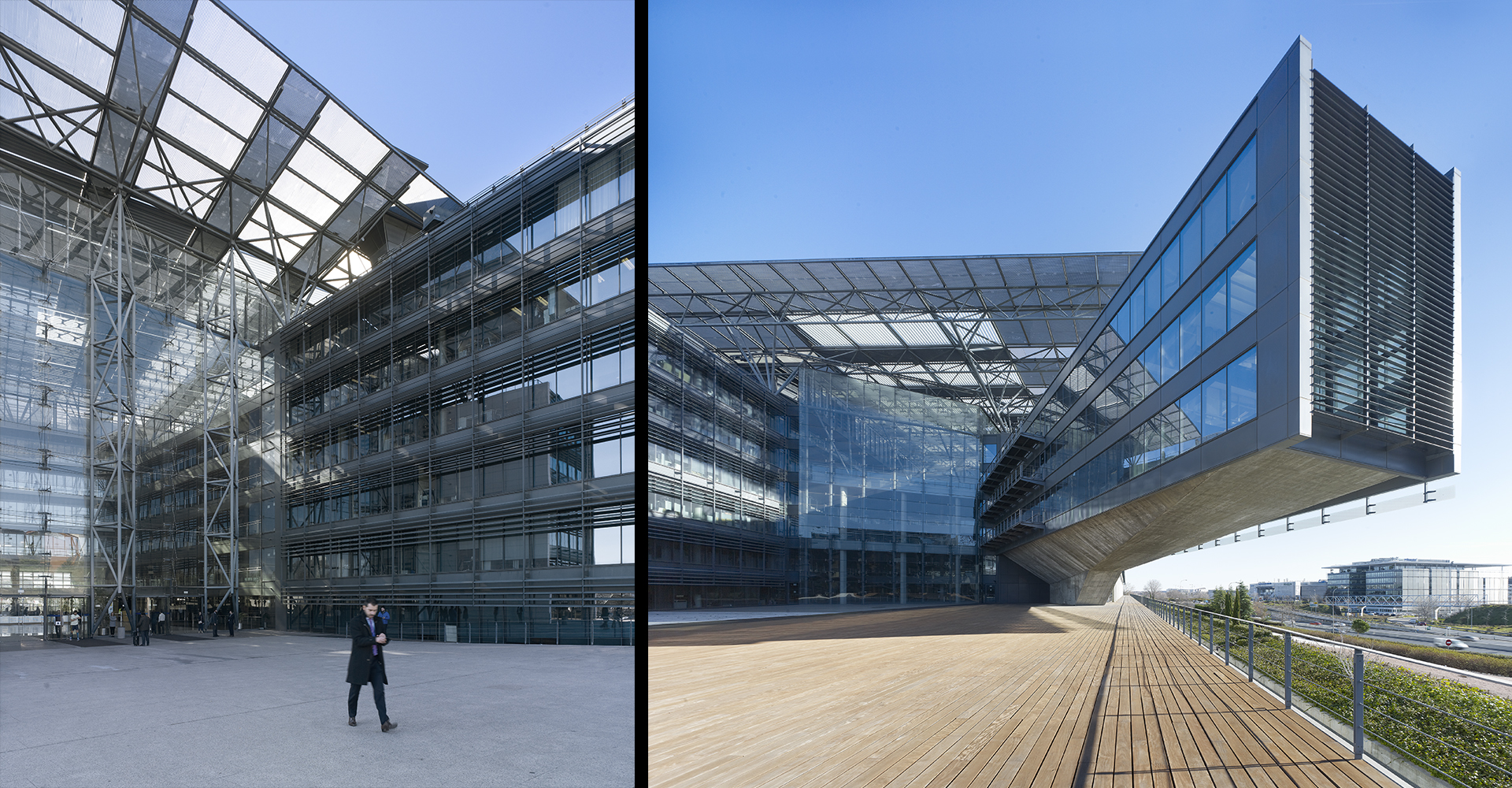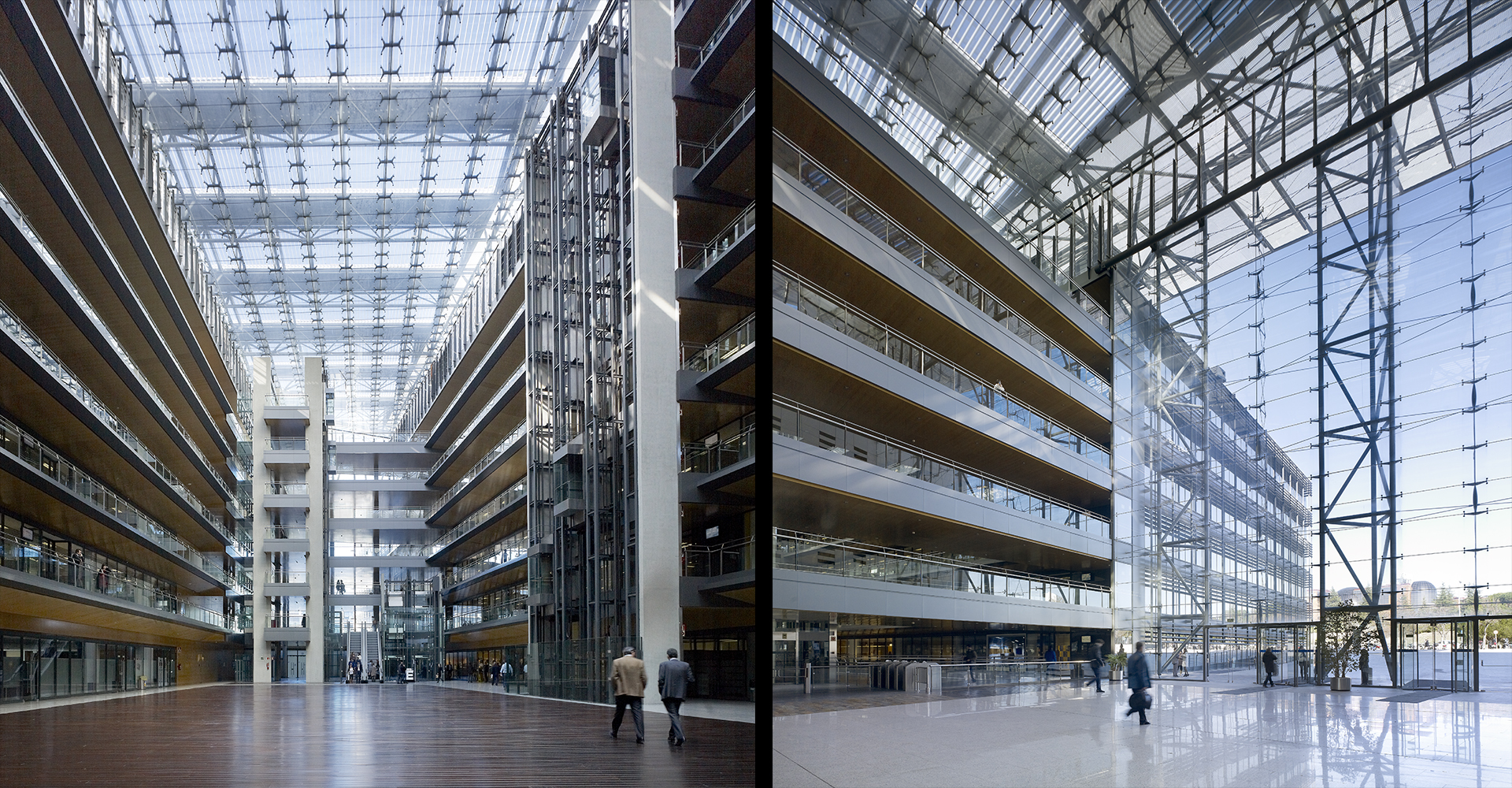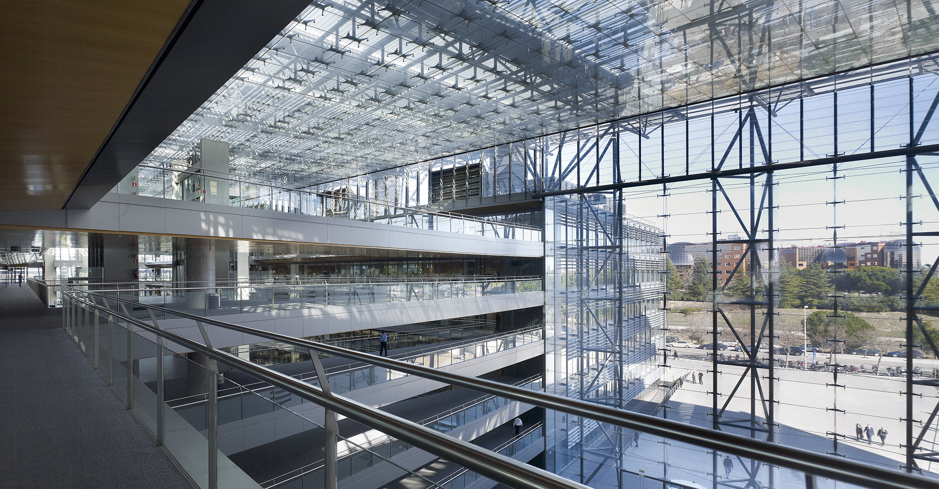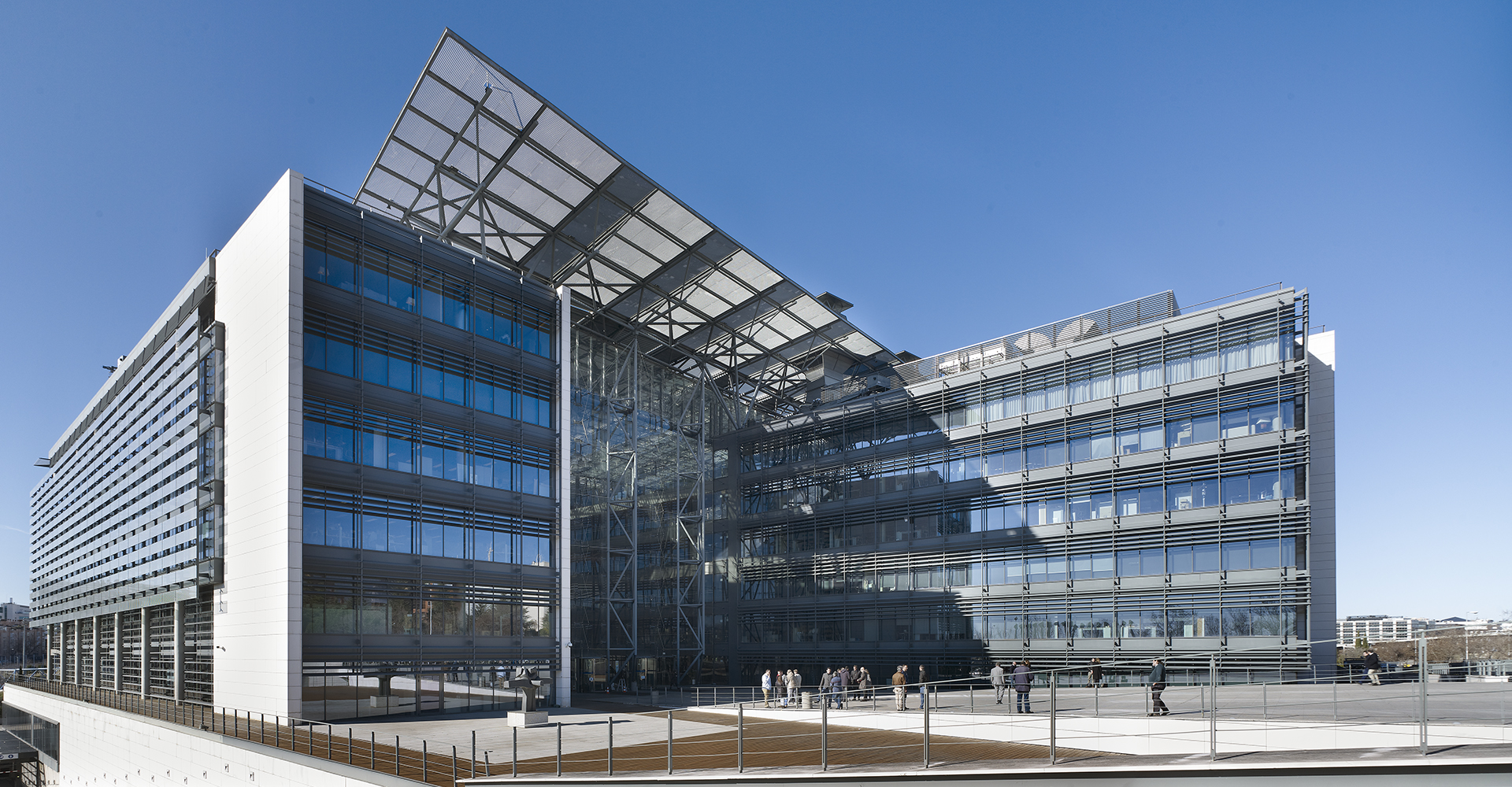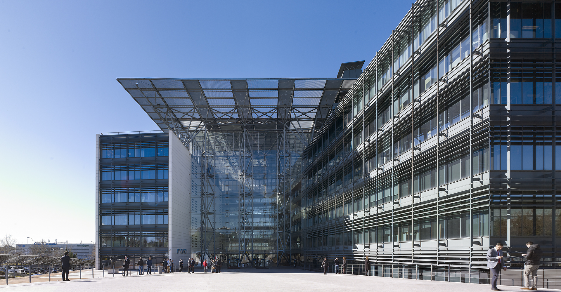 Une toiture monumentale, protectrice et technologique, relie les deux volumes du bâtiment au-dessus de l’autoroute. L’un, replié et en apesanteur, exprime par son extrême longueur la capacité du site et la force de l’entreprise. L’autre, stable et fonctionnel, entrelace son rez-de-chaussée en forme de peigne à l’escalier urbain et piétonnier de la route d’accès. Sous le toit se dessine un vide fragmenté par des passerelles qui le parcourent et le traversent, le divisent en zones plus petites et donnent de l’amplitude à l’escalier. Il s’agit du premier bâtiment en Espagne à avoir reçu la certification triple A en termes de qualification énergétique.