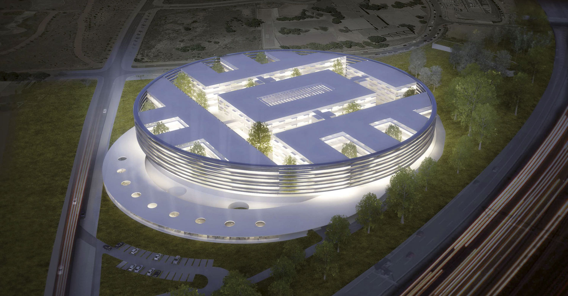 The new campus will be located on a plot of approximately 51,000 m2 located in Sanchinarro, Madrid. On the site there will be buildings or areas that house the different centres and schools, with their different areas and units, as well as their exclusive scientific and technical services (for each centre or school). The set of centres and schools will be provided with a general service area for the Campus and will be assisted by an integrated platform of common scientific and technical services. The layout of all these buildings is inscribed in an exterior circular skin/structure/facade that unifies the complex, promoting in turn a number of advantages, functional flexibility, communications, environmental measures, image, etc., which this complex needs.