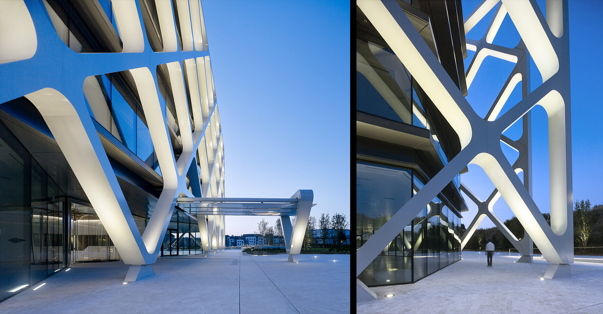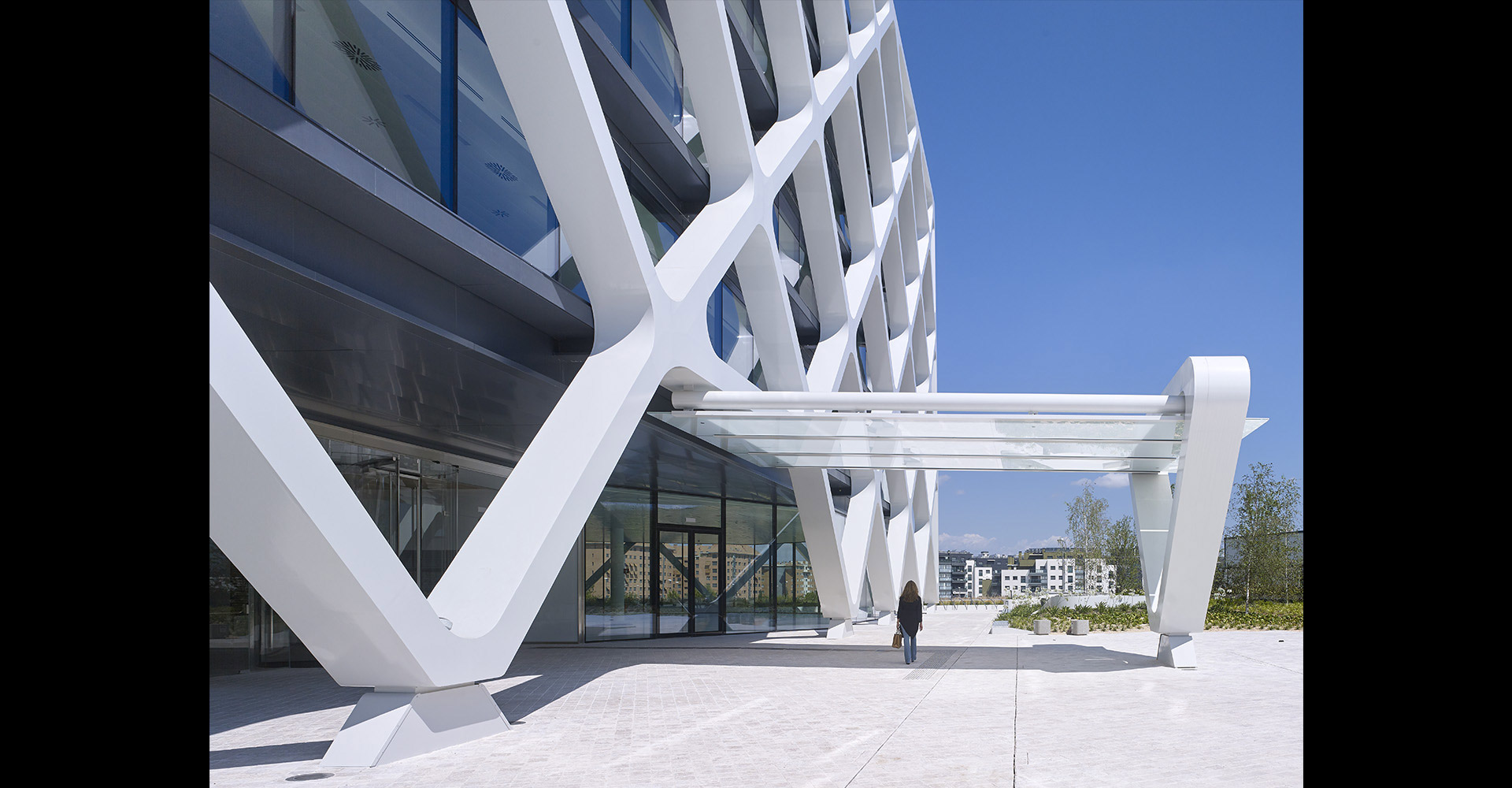 It is a freestanding building, with a triangular floor plan, following an innovative architectural concept that takes the load-bearing structure to the outside of the building forming a latticework, which in turn protects the façade from direct sunlight. This design maximises space on the office floors and leverages natural light. There will be a single central core encompassing vertical transportation, toilets and mechanical rooms.With a surface area above ground covering 14,229 m² distributed over five floors, oxxeo provides 450 parking spaces on two underground floors.